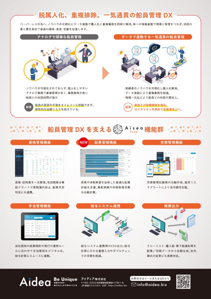 今回の「配乗管理機能」追加により、「Aisea Crew」が配乗管理〜労務管理〜給与計算といった船員管理のコア業務を一気通貫で電子化することが可能なサービスに進化しました。
